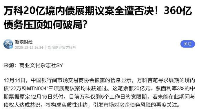 12月,万科突然被卷入一场前所未有的债务风波。原本让市场对万科无比放心的标签,在一次债券展期投票中不再奏效。