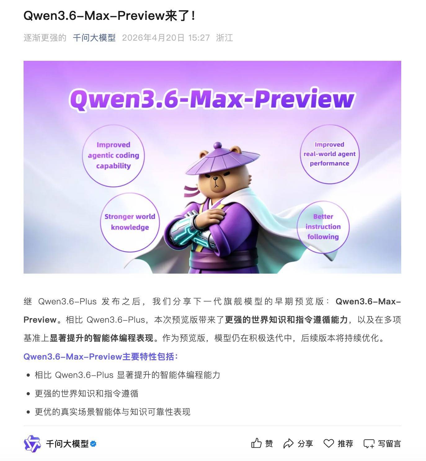 凤凰网科技讯 4月20日,阿里正式推出Qwen3.6-Max-Preview。据介绍,该模型是Qwen系列新一代旗舰模型的早期预览版,用户可以在Qwen Studio进行交互对话,并且即将通过阿里云百炼API以qwen3.6-max-preview的名称调用。